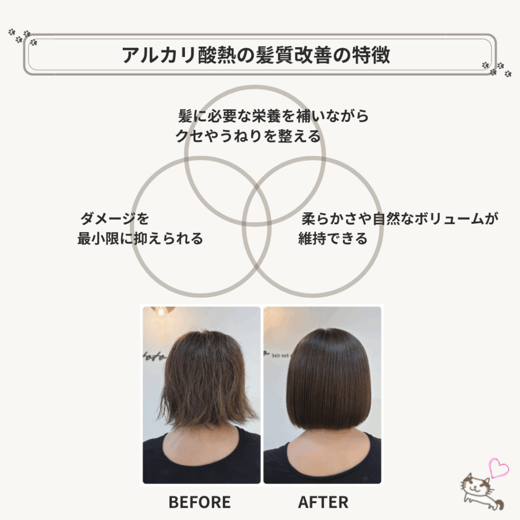 そこでおすすめなのが、アルカリ酸熱を使った髪質改善トリートメントです。
