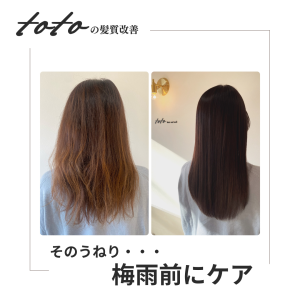 2025年5月17日 / 最終更新日時 : 2025年5月17日 naomimugita703@gmail.com ホームケア 【梅雨対策】前髪だけ?表面だけ?選べる縮毛矯正で、湿気に負けないナチュラルヘアへ☔ 梅雨の時期になると✔︎湿気で髪がうねる✔︎広がってまとまらないといったお悩みをよく耳にします 特に前髪や表面の髪は目につきやすく扱いが難しいですよね そんな季節のお悩みに応えるためにtoto hairでは今年梅雨時期のお […]