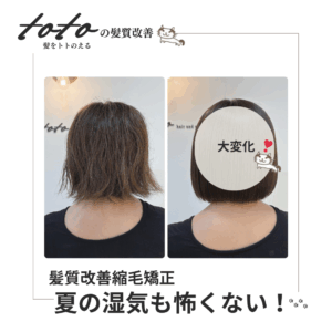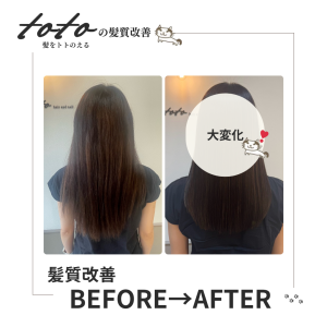 2025年5月31日 / 最終更新日時 : 2025年9月12日 naomimugita703@gmail.com 髪質改善 広がる髪は今日で終わり 触れたくなる艶髪へ totoの髪質改善ビフォーアフター 朝起きて鏡を見るたび“今日も髪がまとまらない…”というお悩みございませんか? ✔︎髪質のせいだから✔︎生まれつきだから・・・✔︎年齢のせいだから仕方ない・・・と諦めていた方に!ぜひ試してほしいのがtotoの髪質改善メニュ […]